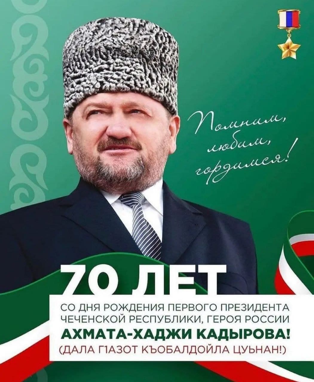 Сегодня исполнилось бы 70 лет выдающемуся религиозному и политическому деятелю современности, нашему Первому Президенту, Герою России Ахмат-Хаджи Кадырову (Дала гIазот къобал дойла цуьнан!). Мы со скорбью вспоминаем этого великого человека, достойного сына чеченского народа, чья воля, непоколебимость и любовь к своей Отчизне помогли спасти от страшных войн наш народ.